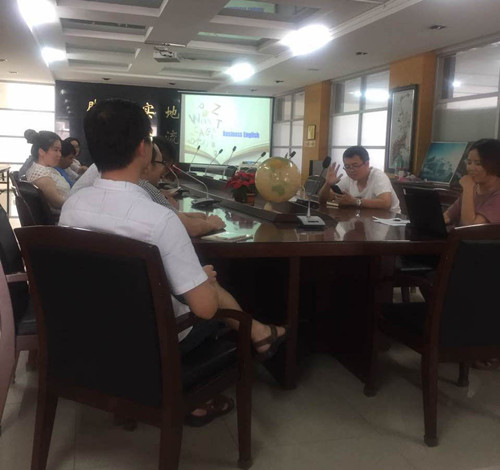 本次活動(dòng)由國貿(mào)部許經(jīng)理主持,主題是基礎(chǔ)商務(wù)英語的應(yīng)用,圍繞著Welcoming(歡迎詞)、Introduction(自我介紹)、Greetings(招呼問候)、Offering(提議)、Hotel( 酒店)、Small talk topics(閑聊話題)這幾個(gè)話題來開展。首先由國貿(mào)部許經(jīng)理用一口流利的英語歡迎大家,進(jìn)入第一環(huán)節(jié),先是由各位開發(fā)人員充分運(yùn)用自己的英語能力,介紹了自己的英語名字,個(gè)人的喜好,此環(huán)節(jié)用英語調(diào)動(dòng)開發(fā)人員表達(dá)能力的積極性,用已有的英語水平表達(dá)自己的觀點(diǎn)、意愿,使整個(gè)英語沙龍活動(dòng)沉浸在和諧的氣氛里。第二環(huán)節(jié),由國貿(mào)部業(yè)務(wù)員扮演了展會(huì)上國外客戶參觀我司展臺(tái),我司業(yè)務(wù)員接待客戶,講解產(chǎn)品功能的一個(gè)演示,表演過程中表情豐富,語言風(fēng)趣,為全場營造了一種活躍熱鬧的氛圍。進(jìn)入后面的Offering(提議)、Hotel( 酒店)、Small talk topics(閑聊話題)幾個(gè)環(huán)節(jié),大家選擇一個(gè)主題,用英語交流演示,此環(huán)節(jié)以一種無比輕松的不同于培訓(xùn)形式的方式給每位開發(fā)人員提供了操練口語的時(shí)機(jī),激發(fā)了開發(fā)人員學(xué)習(xí)英語的熱心。