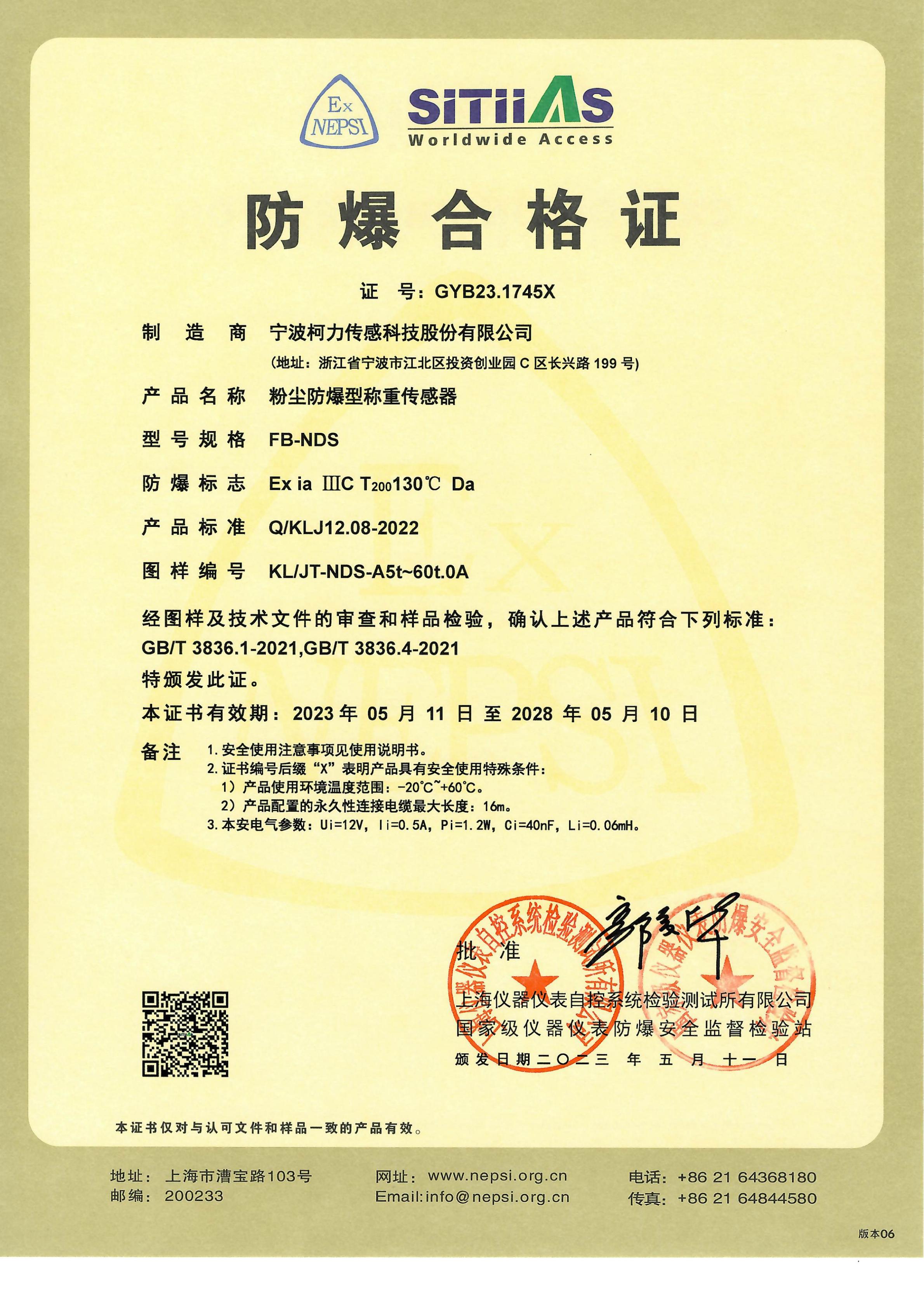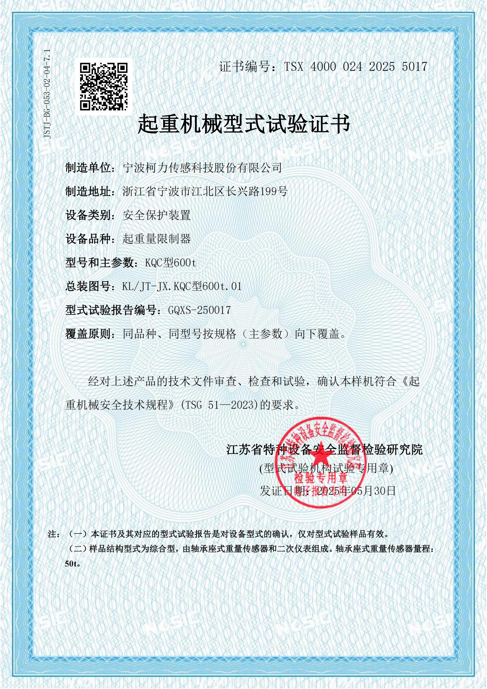 型式批準(zhǔn)證書(shū)SQB(鄭州柯力)